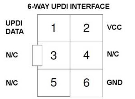 As it doesn’t have a clock, the only pin is Reset for programming data. The Reset pin can be configured to be either reset, UPDI or GPIO in fuse bytes, default for new devices is UPDI. If this is changed, a 12V pulse is needed to enter programming mode and reprogram the chip. Not all programmers support this 12V pulse so be careful when changing reset configuration or you can lock yourself out.