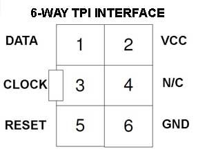 Although only one pin is used plus VCC and GND, Microchip recommend a 6-way 3 x 2 pin header as the programming connector.