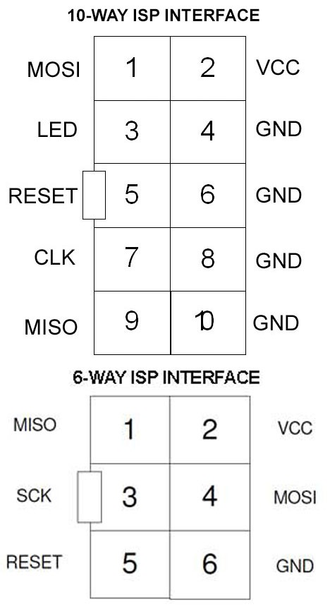 This programming method is simple and gives few problems if you follow the rules on the ISP interface in your circuit – see AVR ISP Circuit Guide. The standard header recommended by Atmel was a 5 x 2 10-Way box header at 2.54mm (0.1″) pitch. This had interleaved ground lines to improve reliability but Atmel decided these weren’t necessary so moved to a 3 x 2 6-way header.